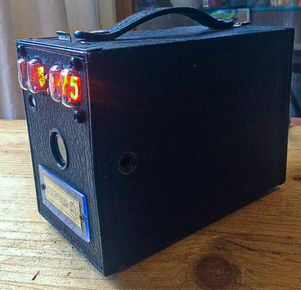 The Brownie No. 2 model F Nixie Clock camera is a unique timepiece from 20’s that combines the classic design of an old vintage camera with modern technology to create a one-of-a-kind nixie clock.