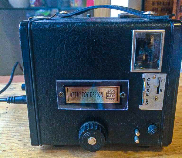 The Brownie Camera Nixie Clock camera series is one of his most popular Attic Toy Design creations and is highly sought-after by collectors and enthusiasts of unique and unusual clocks.