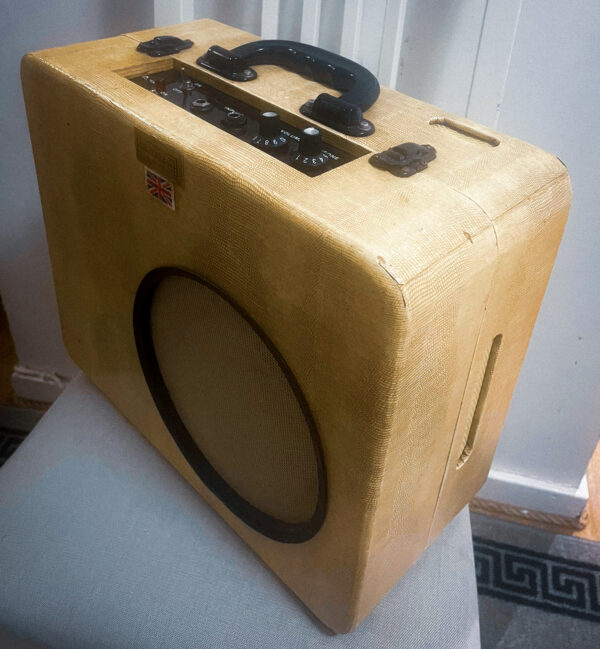 This vintage Philips turntable case was used to create this unique amplifier is in excellent condition, with only minor signs of wear and tear. The front panel has been beautifully customized to match the vintage aesthetic, with a stylish grille cloth and vintage-style knobs. A Celestion 8″ built-in speaker delivers a powerful output, 2 input jacks, an additional line-out jack for recording or connecting to an external amplifier completes this amazing unique project.